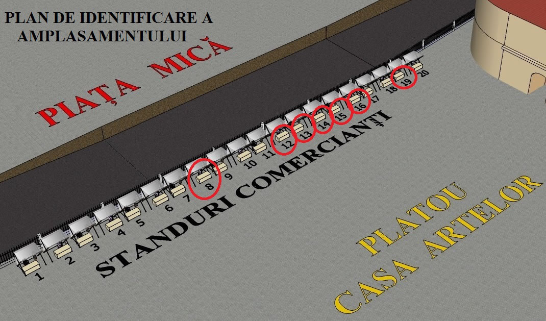- 7 standuri de prezentare și vânzare și amplasamentul aferent acestora, în suprafață de 4 mp aparținând domeniului public situat în Piața Mică din Municipiul Sibiu;